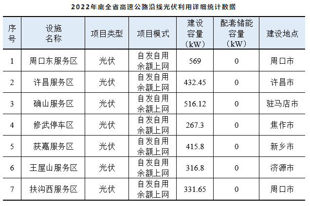 2022年1月,《“十四五”现代综合交通运输体系发展规划》正式印发,为“光伏+交通”指明了方向。文件提出,鼓励在交通枢纽场站以及公路、铁路等沿线合理布局光伏发电及储能设施。2月,交通运输部印发《关于积极扩大交通运输有效投资的通知》,指出,因地制宜推进公路沿线、服务区等适宜区域合理布局光伏发电设施。截至2022年底,河南省高速公路总里程达8009公里,共建成服务区、停车区165对,高速公路绿色低碳发展初见成效。高速公路沿线新能源设施建设有序推进,2022年,全省高速公路沿线建成光伏发电运营装机容量0.948兆瓦,光伏发电累计装机总容量达到2.849兆瓦,年发电总量2115.761万千瓦时。