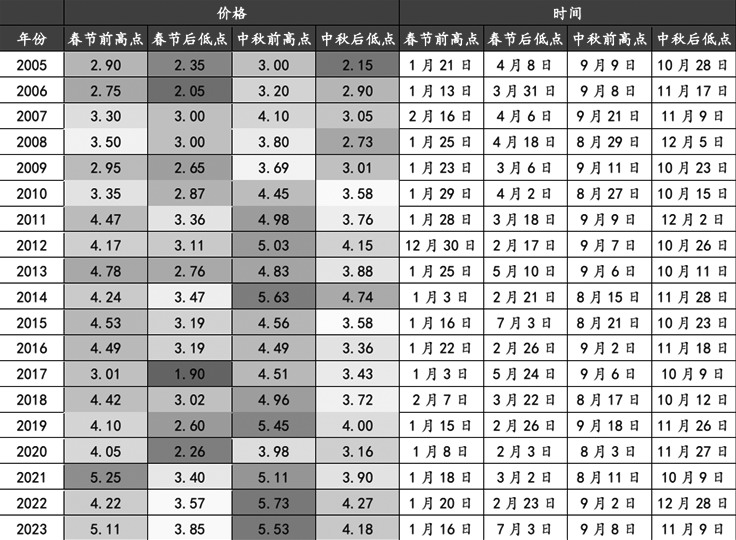 表为2005—2023年鸡蛋淡旺季价格差距(单位:元/斤)