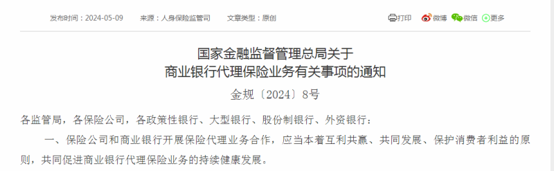 对于备受关注的银保渠道,监管又有新动作。5月9日,金融监管总局发布《关于商业银行代理保险业务有关事项的通知》(以下简称“通知”)。